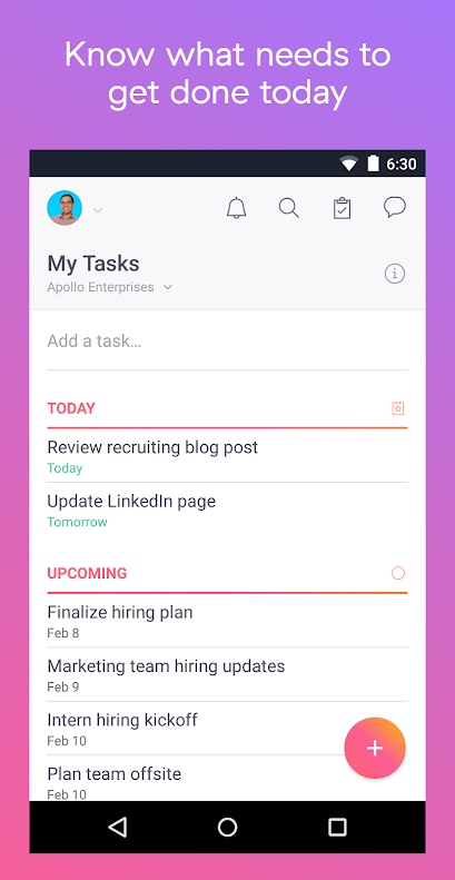 La aplicación de gestión de proyectos móviles de Asana te brinda información detallada sobre todos tus proyectos desde cualquier lugar. Donde quiera que estés, Asana te actualiza rápidamente en tus tareas y las de tus compañeros. Úsalo para agregar una acciones a las tareas pendientes, recordatorios, ideas y solicitudes, crear proyectos para organizar los proyectos en listas o tableros completos con fechas de vencimiento, asignados, seguidores, detalles y archivos, y comentar tareas para aclarar instrucciones o hacer preguntas.