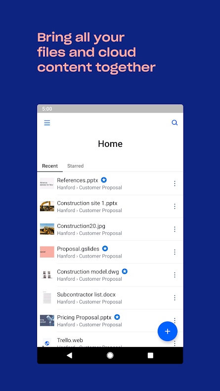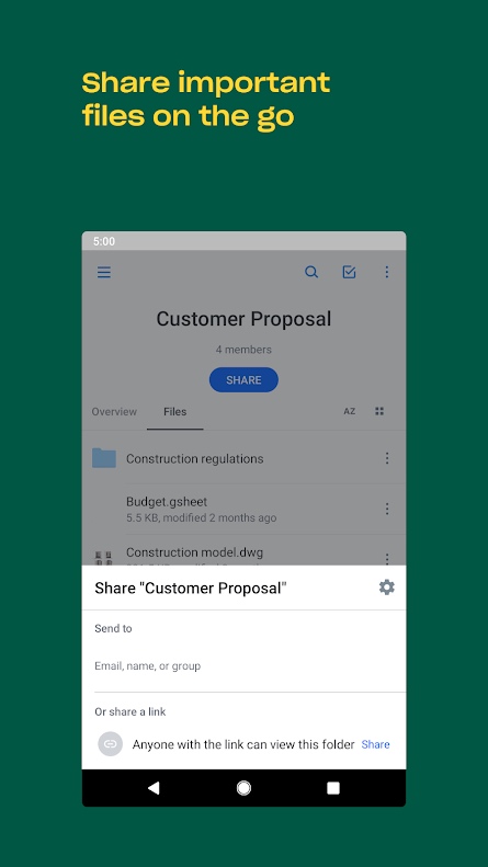 Las funciones para compartir facilitan el envío privado de archivos de cualquier tamaño a compañeros de trabajo, y puedes acceder a cualquier archivo en tu cuenta, incluso sin conexión. Los archivos se comparten a través de un enlace en lugar de adjuntos de correo electrónico. También puedes usar la aplicación para escanear documentos con tu cámara y transformar recibos, documentos, pizarras y notas en archivos PDF.