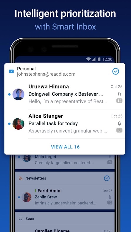 Casi cualquier persona que utiliza el correo electrónico para el trabajo recibe toneladas de mensajes no solicitados o que no son importantes. Tomar el control significa priorizar efectivamente los mensajes que demandan acción inmediata y los que se pueden guardar para más adelante. Spark es un limpiador de mensajes, que ayuda a concentrarse, dejando los más importantes en la parte superior de tu buzón. Puedes anclar y responder mensajes importantes y archivar por lotes el resto. Además, un widget de pantalla de inicio te permite ver la cantidad de correos electrónicos no leídos, buscar o redactar uno.