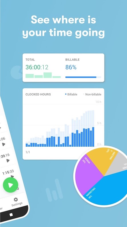 La aplicación presenta informes analíticos de gestión del tiempo, calendarios integrados, sugerencias sobre cómo realizar un seguimiento de las actividades, notificaciones que mantienen tu seguimiento directo y la capacidad de personalizar y organizar tus clientes y proyectos.