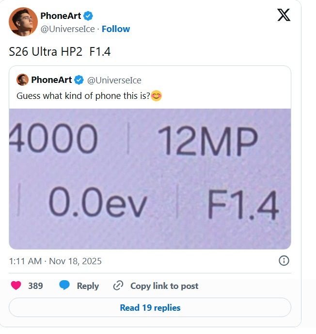 - Ahora, el informante afirma que el f-stop pertenece al sensor principal de 200MP del próximo Galaxy S26 Ultra.