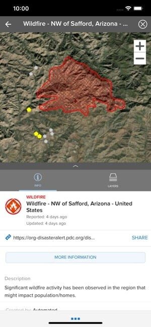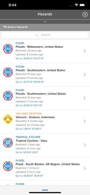 Basada en la plataforma DisasterAWARE del PDC, el mapa interactivo de Disaster Aware muestra 18 tipos diferentes de riesgos activos con actualizaciones casi en tiempo real. No solo puedes recibir alertas tempranas sobre tsunamis, tornados, huracanes, incendios forestales o terremotos, entre otros peligros, sino que también recibirás información actualizada sobre eventos climáticos importantes como vientos fuertes y tormentas. Aquellos que quieran conocer el detalle del suceso pueden ver informes de análisis de situación y superposiciones de mapas que muestran la cobertura global, las densidades de población y demás información relevante. Es fácil personalizar las alertas y notificaciones según tu ubicación y la gravedad del peligro, y cuenta además con mapas de fondo personalizables.