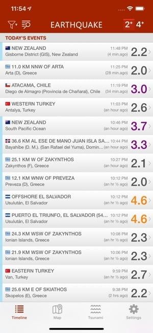 La aplicación de detección de terremotos número uno del mundo extrae datos de múltiples fuentes fiables como el Servicio Geológico de Estados Unidos, GeoScience Australia y el Centro Sismológico Europeo-Mediterráneo y puede enviar hasta cuatro alertas en función de la ubicación y la magnitud de un terremoto. El mapa muestra círculos de diferentes tamaños y colores relacionados con el tiempo y la magnitud de los terremotos en todo el mundo y es fácil de filtrar por ubicación o magnitud. Al hacer clic en un evento, se muestran datos más detallados, como magnitud, profundidad, coordenadas de ubicación y hora de origen, y es fácil exportar datos a Google Earth o compartirlos con amigos y familiares por correo electrónico, Facebook o Twitter.