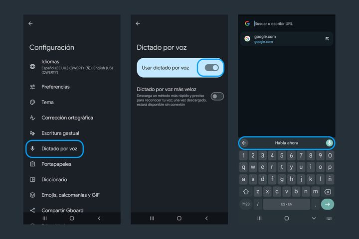 Hablar es más rápido que escribir. Por eso, te recomendamos activar la opción de dictado por voz en tu celular, una función disponible tanto en los teclados de iOS como en Android. Para hacerlo, simplemente toca el icono del micrófono en tu teclado y comienza a hablar. Si no encuentras el icono, sigue las indicaciones de la imagen de arriba para activarlo en la configuración del teclado.
