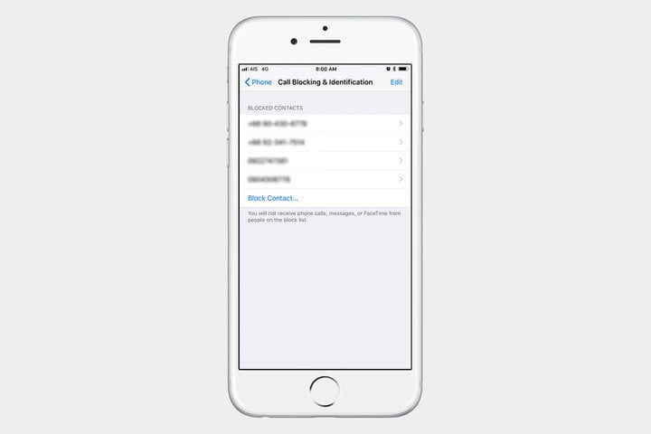 Paso 3: Bloquea el número: Pulsa la opción Block Contact (Bloquear Contacto) y selecciona el número que deseas bloquear de la lista de contactos. Para desbloquear un usuario, simplemente pulsa la opción Edit (Editar) en la parte de arriba a la derecha de la página Call Blocking & Identification (Bloqueo de llamadas & Identificación), seguida de un signo de sustracción que está al lado del contacto que deseas desbloquear.