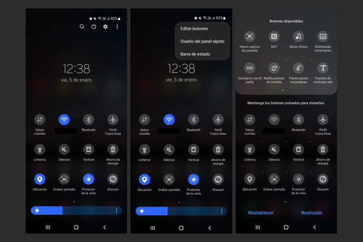 Oculta los botones extendiendo el Panel rápido hacia abajo (el menú superior con iconos como Wi-Fi, Datos móviles, etc.) hasta que aparezcan los tres puntos verticales. Toca la opción Editar botones y saca del cajón principal todos lo que no quieres que tus padres toquen, incluyendo No Molestar.