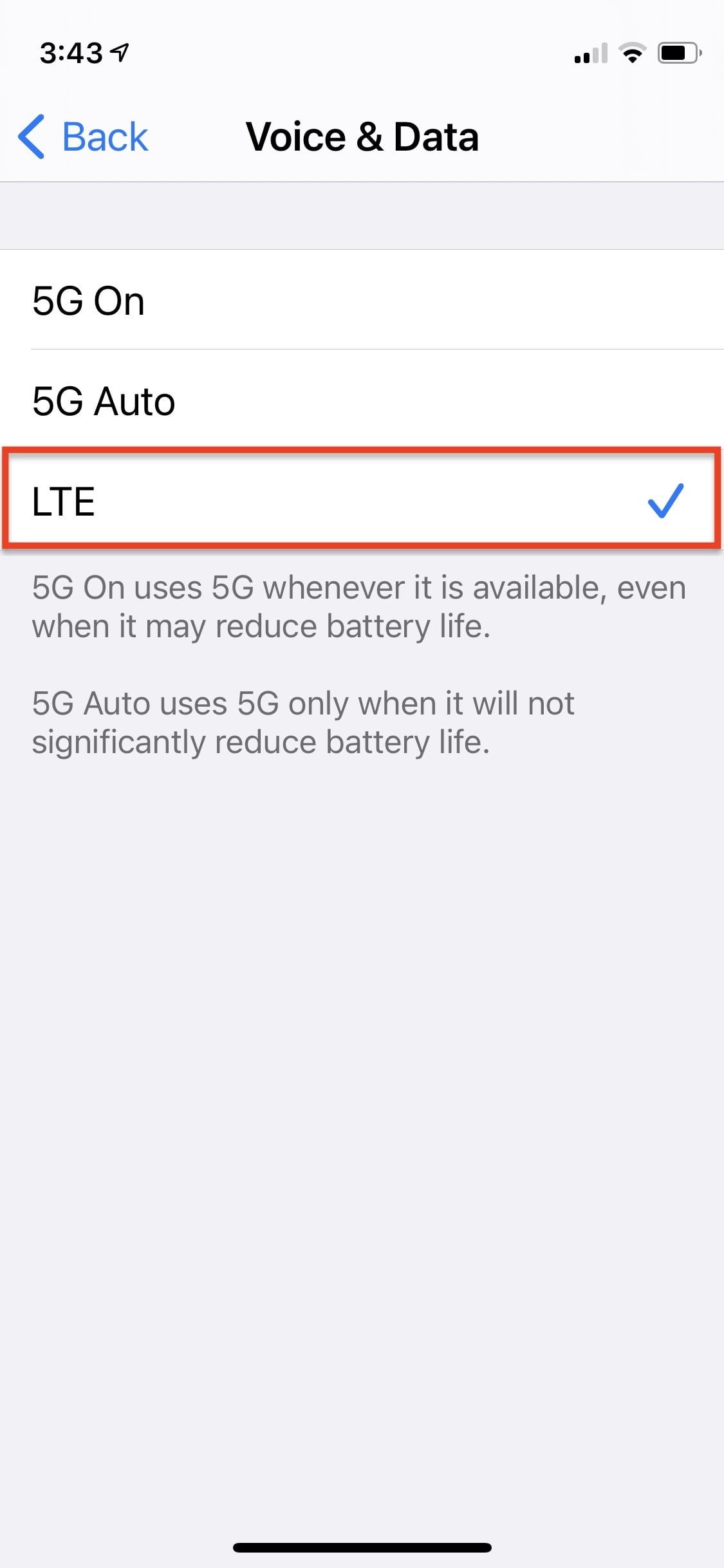 Paso 4: Toca LTE para evitar que el teléfono use 5G. Puedes volver a activarlo cuando quieras.