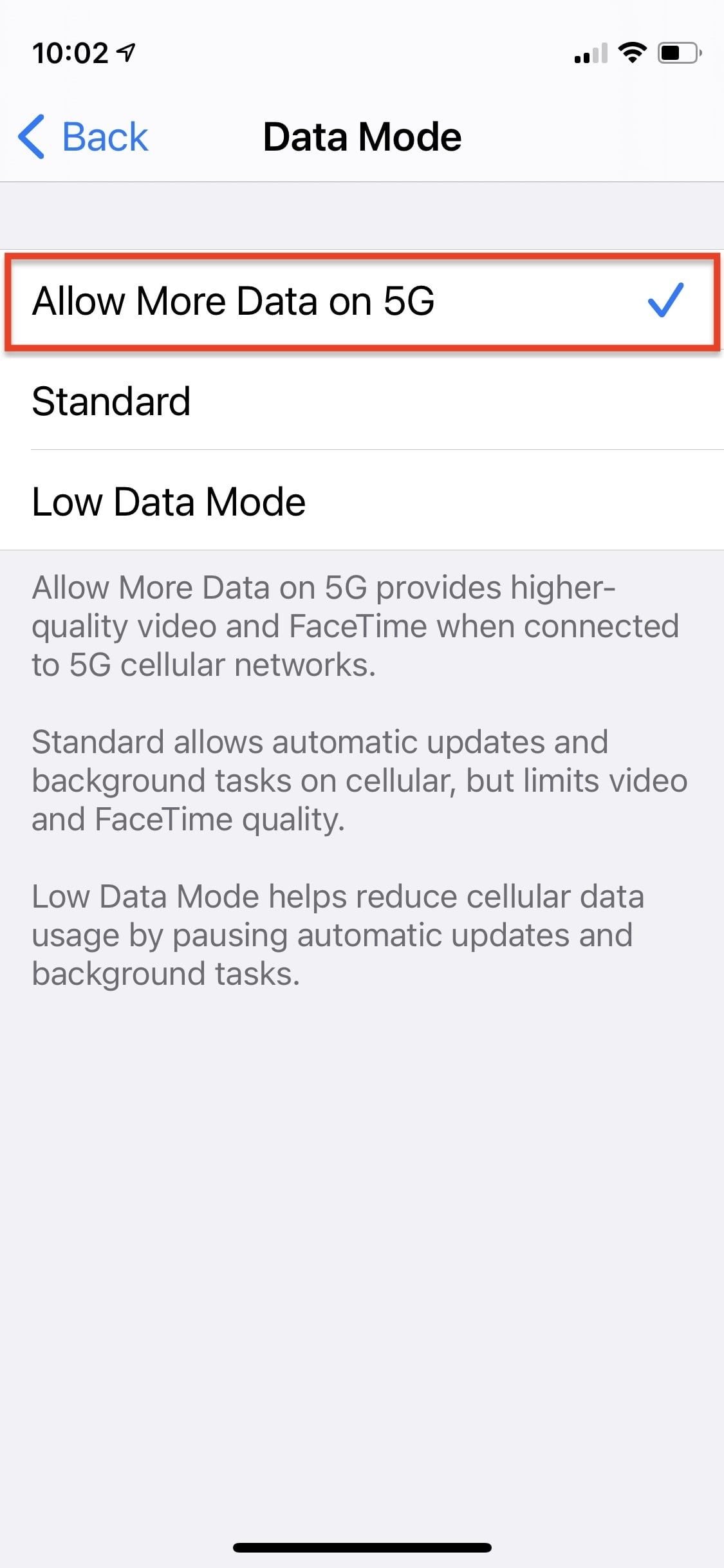 ¿Qué deberías hacer? Las opciones predeterminadas de Apple son las más eficientes para la mayoría de las personas, así que no te sientas obligado a jugar con la configuración. Entre el teléfono y el operador, el uso de la red entrega la mejor combinación de velocidad y uso de la batería. También puedes cambiar tu modo de datos seleccionando Permitir más datos en 5G en lugar del modo Estándar que viene de manera predeterminada. Esto permite que el teléfono use 5G para todo lo posible, incluso para maximizar la calidad de transmisión de video o videollamadas.