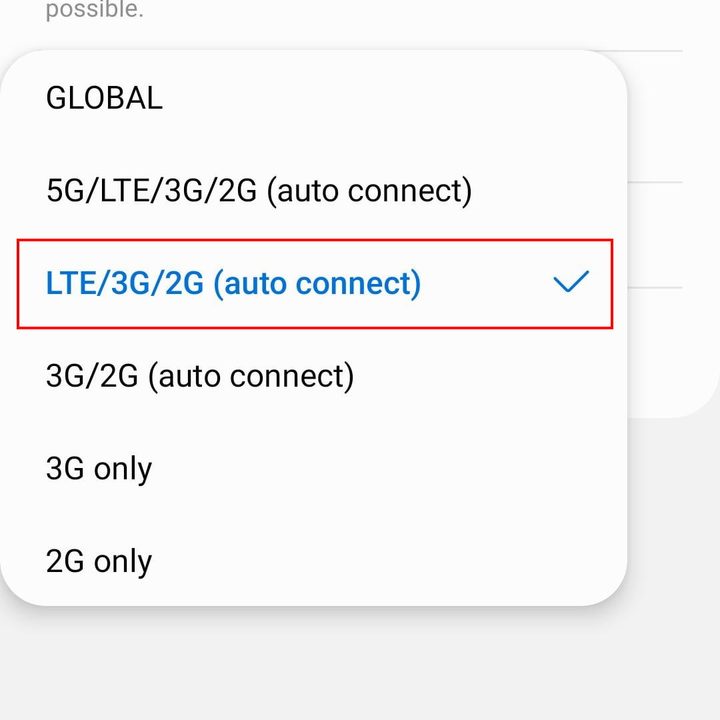 Paso 4: selecciona LTE / 3G / 2G (Auto) de la lista, o una de las otras opciones que no sea 5G para evitar que el teléfono use dicha conectividad. Es fácil volver a activarlo cuando lo quieras de nuevo.