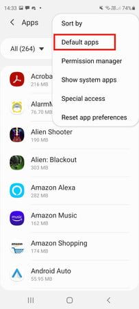 - Toca los tres puntos agrupados verticalmente en la esquina superior derecha para ver más opciones y elige Apps predeterminadas.