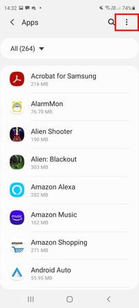 - Toca los tres puntos agrupados verticalmente en la esquina superior derecha para ver más opciones y elige Apps predeterminadas.