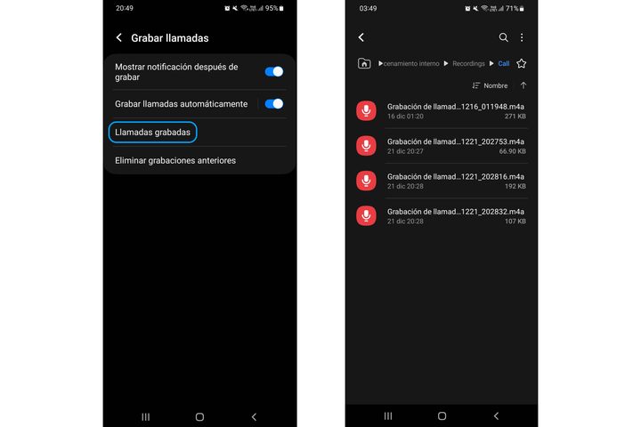 Al terminar la grabación de una llamada, recibirás una notificación que dice “Llamada grabada” informándote que el archivo quedó guardado en el almacenamiento interno. Si pulsas en ella, te aparecerá el listado de grabaciones y podrás escuchar la que acabas de grabar.