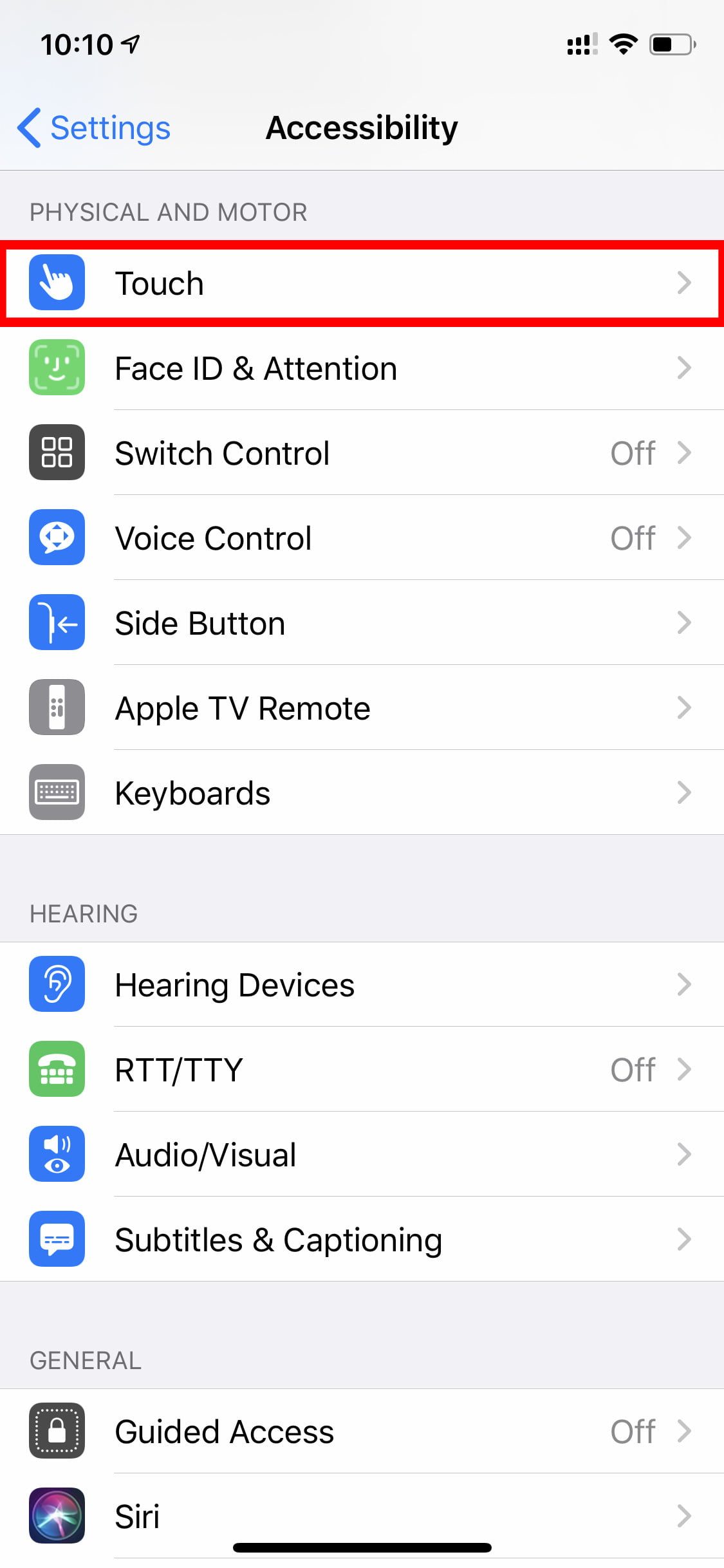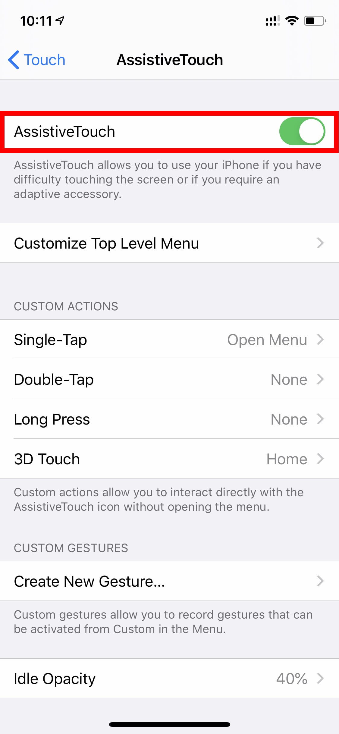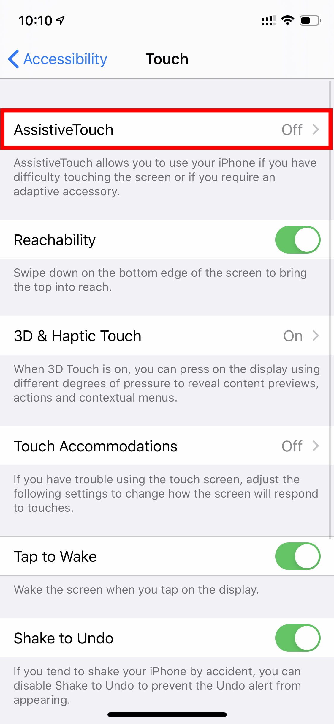 Paso 1: activar AssistiveTouch. Con AssistiveTouch, puedes realizar acciones táctiles más complejas. Esto incluye pellizcar, activar el 3D Touch o pasar varios dedos. Para activarlo, ve a Ajustes>Accesibilidad>Tocar>AssistiveTouch y cambia a AssistiveTouch. Si usas AssistiveTouch estrictamente para las capturas de pantalla, puedes usar los siguientes pasos para configurarlo como tu única acción disponible.