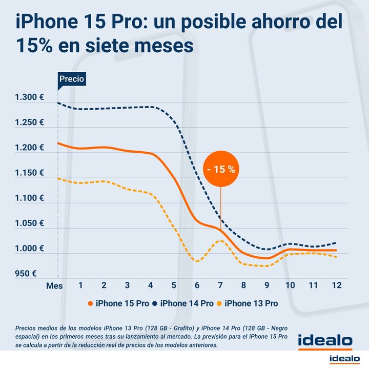 Según el estudio de idealo, tanto el iPhone 15, el iPhone 15 Pro y el iPhone 15 Pro Max compartirían un punto de inflexión en sus precios a partir del sexto mes desde sus lanzamientos: esto es, en marzo de 2024.