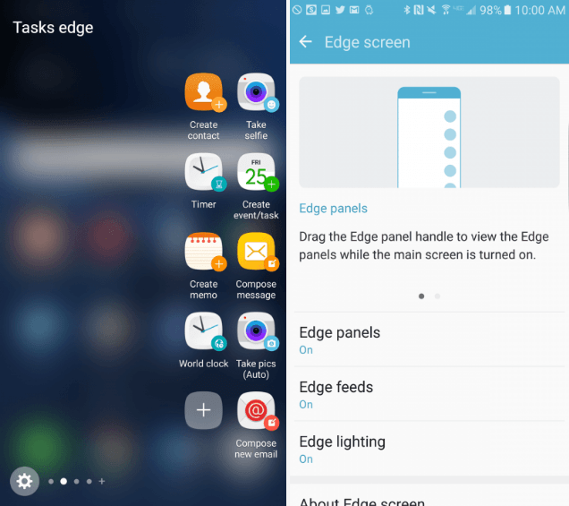 Puedes también intercambiar las fuentes y descargar nuevas dirigiéndote a Configuración> Pantalla de borde> Edge feeds. Cambiar los paneles de los bordes es muy fácil. Dirígete a Configuración> Pantalla de borde> Paneles de borde y verás tres opciones diferentes: App Edge te permite seleccionar tus 10 aplicaciones favoritas; el People Edge te permite elegir cinco contactos; y el Tasks permite configurar hasta 10 accesos directos para las tareas.