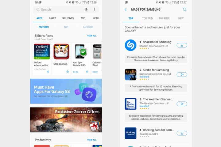 Dentro de las aplicaciones Galaxy se encuentra una sección llamada “Made for Samsung“. Aquí encontrarás versiones de aplicaciones populares que han sido modificadas especialmente para que funcionen mejor con tu Galaxy S8. Y, lo más importante, también encontrarás aplicaciones que incluyen ofertas especiales solo para los propietarios de Samsung Galaxy. Un ejemplo notable de esto es la inclusión de Kindle para Samsung, la cual te ofrece un libro electrónico gratuito todos los meses durante doce meses, tres meses gratuitos de Pro + premium en Workout Trainer para Samsung y funciones exclusivas en The Weather Channel solo para usuarios de Galaxy.