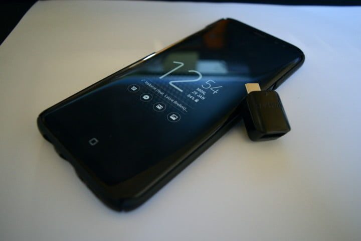 Por el lado negativo, el adaptador requiere un ajuste bastante cercano al puerto de carga de tu S8, por lo que —en muchos casos— lo anterior podría interferir con la capacidad para enchufar la carga. Pero una vez que hayas enchufado el adaptador, puedes acceder y transferir archivos a memorias USB, conectar un controlador USB alámbrico (probamos con un controlador Xbox 360 original, y funcionó) o incluso conectar un teclado o mouse a tu teléfono para facilitar el trabajo en la oficina. Y si conectas el cable de carga de otro teléfono al adaptador, le sacarás algo de “jugo”, permitiendo que la poderosa batería de tu S8 entre en acción y salve al teléfono de un amigo de una muerte inminente.