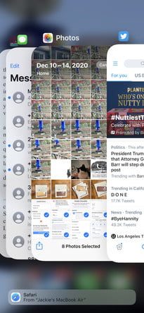 - Cambia de app: arrastra hacia arriba y luego a la izquierda o a la derecha desde la parte inferior de tu teléfono para ver las aplicaciones abiertas y después desliza hacia arriba cualquiera que quieras cerrar.