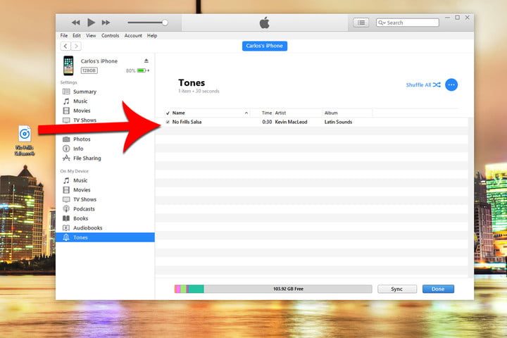 Nota: Si tienes problemas para arrastrar el archivo .m4r a la pestaña Tonos después de aplicar los cambios, desconecta tu iPhone y reinicia iTunes. Luego, conecta tu iPhone e intenta arrastrar el archivo a la ventana nuevamente.