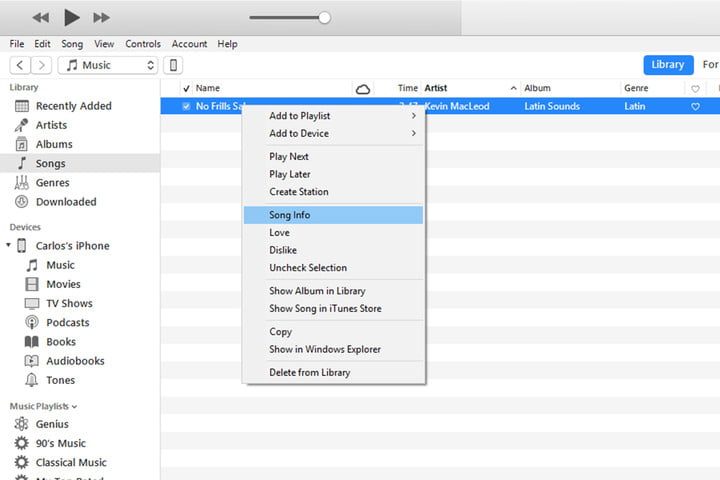 Una de las características menos conocidas de iTunes y de Apple Music es la habilidad de “cortar” canciones y videos, lo cual te permite elegir momentos específicos para que empiece y termine. Primero haz clic derecho o Ctrl y clic en la canción que quieres seleccionar y haz click en Song info (Información de la canción) del menú resultante.