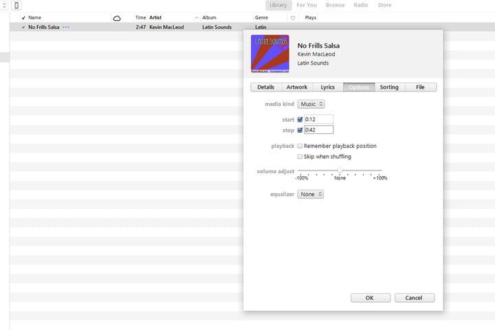 Después, selecciona la pestaña Options (opciones) en la parte de arriba de la ventana. Deben a parecer dos espacios en blanco para que ingreses los minutos de inicio y el de finalización. Recuerda que los ringtones tienen un máximo de 30 segundo de duración. Posteriormente, pulsa el botón OK.