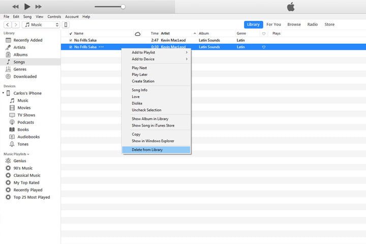 Probablemente ya no necesites la canción abreviada en iTunes, por lo que es sensato eliminar el archivo para evitar desórdenes innecesarios y para asegurarte de que no lo reproducirás accidentalmente cuando quieras escuchar la canción completa. Haz clic con el botón derecho o presione Ctrl y haga clic en el archivo AAC en iTunes y selecciona Delete From Library (Eliminar de la biblioteca) en el menú desplegable resultante. Luego, haz clic en el botón Delete File (Eliminar archivo), si se le solicita.
