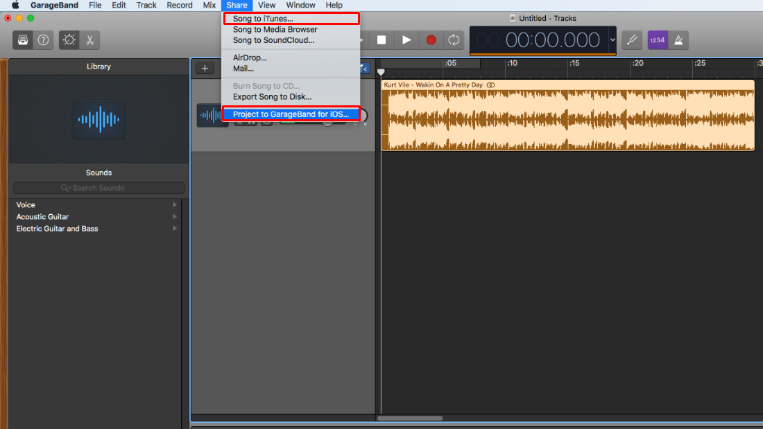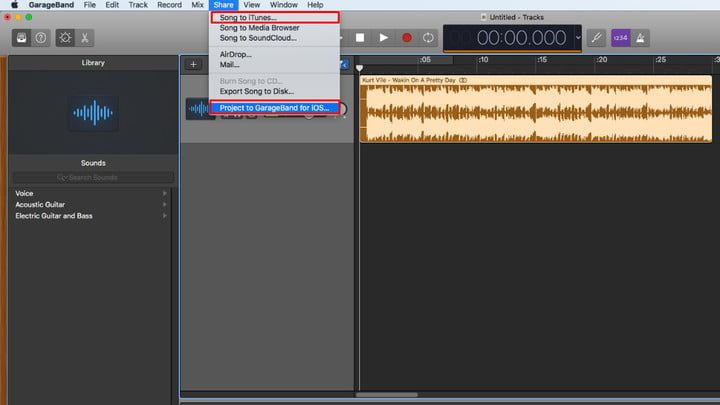 Desde este menú, puedes exportar la canción a iTunes o como un archivo de GarageBand para iOS.