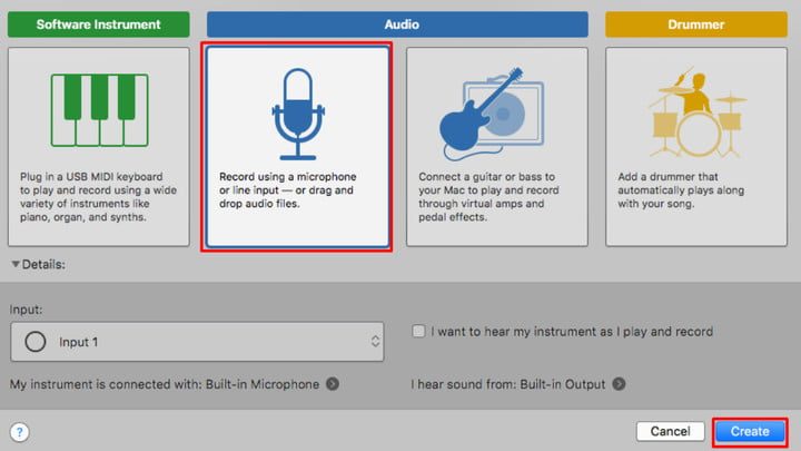 A continuación, haz clic en el botón del micrófono debajo del encabezado Audio, luego haz clic en Crear.