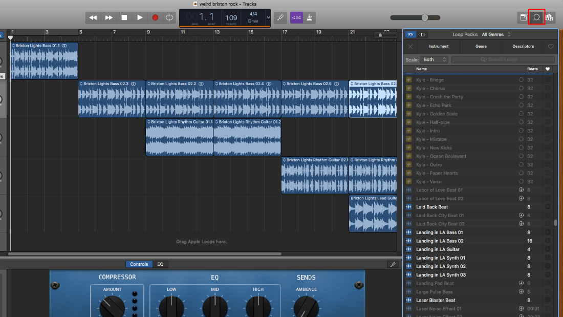 También puedes crear tu propia canción a partir de los bucles disponibles en GarageBand. Nuevamente, crea un Proyecto vacío, luego haz clic en el botón del micrófono y en Crear. En la esquina superior derecha, haz clic en el icono de bucle.