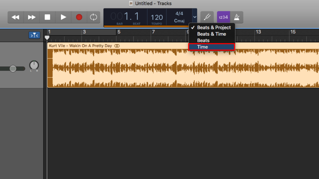 Tu tono de llamada tendrá que ser de 30 segundos o menos, por lo que probablemente necesitarás recortar el archivo a una sección específica. Primero, haz clic en el menú desplegable en la mitad superior de la pantalla y selecciona Beats & Time o Time.