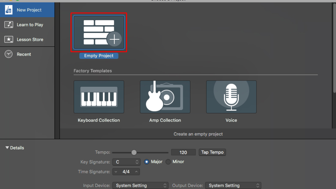 Abre GarageBand, luego selecciona Proyecto vacío.