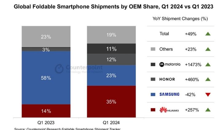 El ganador fue Huawei, que vendió la mayor cantidad de teléfonos inteligentes plegables en el primer trimestre de este año (de enero a marzo), según un nuevo informe publicado por Counterpoint Research.