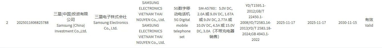 El organismo regulador chino de 3C ha incluido el aparente Galaxy A57 5G (número de modelo SM-A5760), y este documento menciona una velocidad de carga de 45W. En la captura de pantalla de abajo, se indica soporte para carga de 10V/4,5A o 15V/3A.