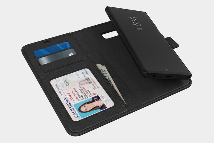 Este estuche para el Note 8 tiene un diseño muy inteligente. El exterior es como una cartera de cuero con unos acabados texturizados y con costuras.