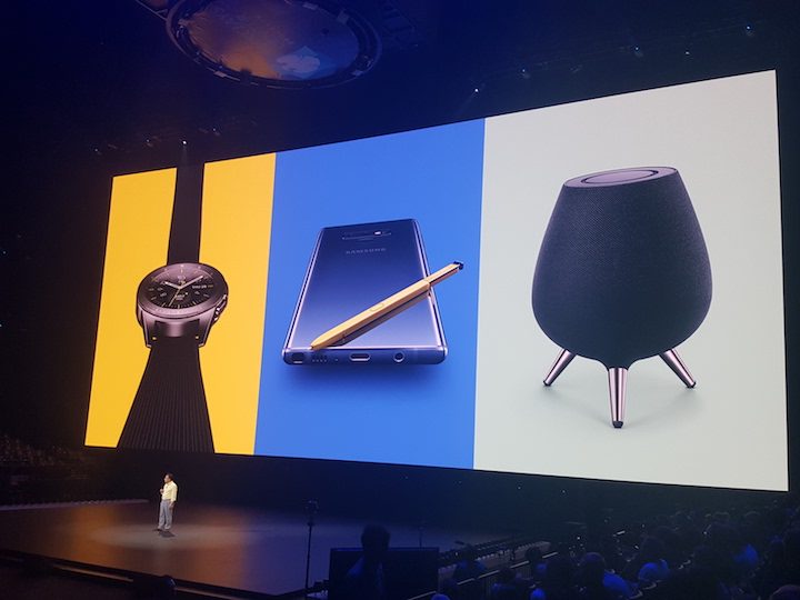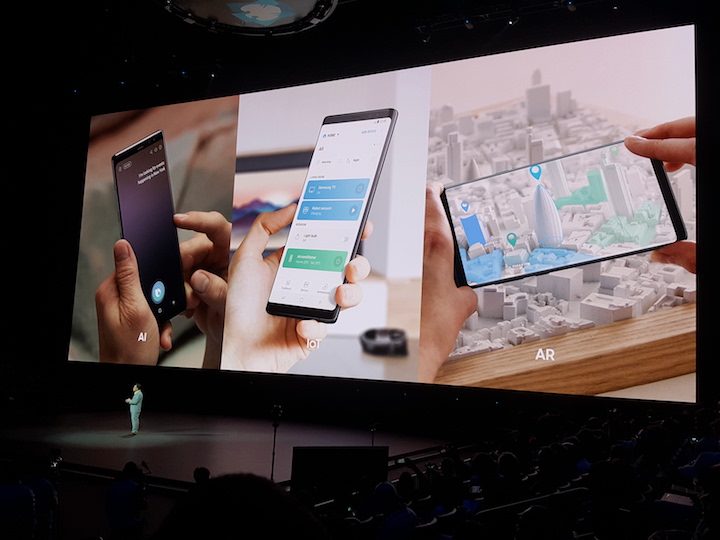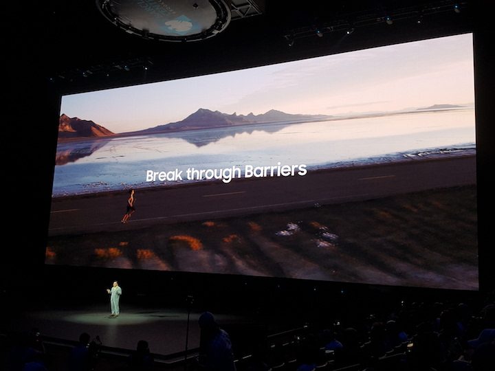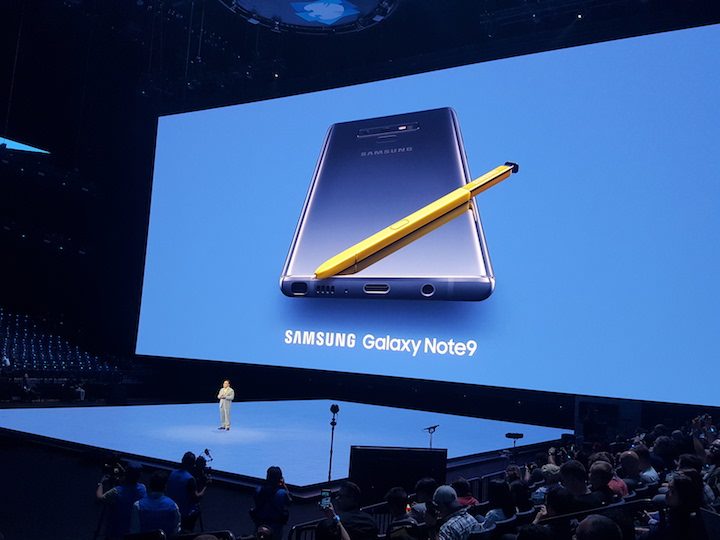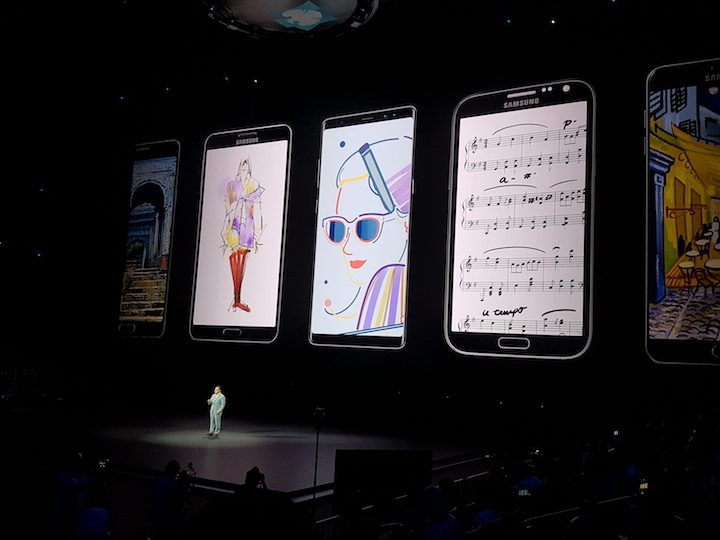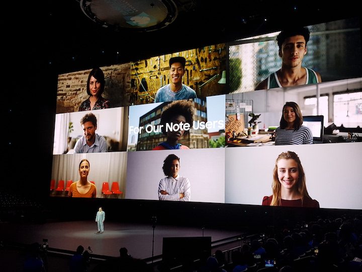 Comenzó el desfile de oradores, quienes fueron enumerando todos y cada uno de los nuevos puntos fuertes del nuevo Galaxy Note 9. Especialmente efectivo fue el momento en que se tomaron las fotografías usando el S Pen como disparador. Algunos ya lo sabíamos, y otros lo sospechaban. Pero parece que eran muchos los que no se lo esperaban. El S Pen puede activar la cámara y sacar fotos con una distancia de hasta 30 pies del teléfono. Ovación cerrada, y segundo as sobre la mesa.