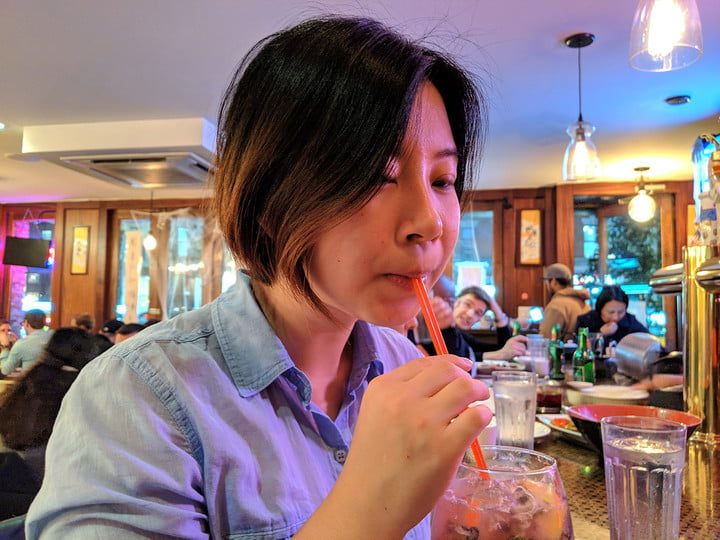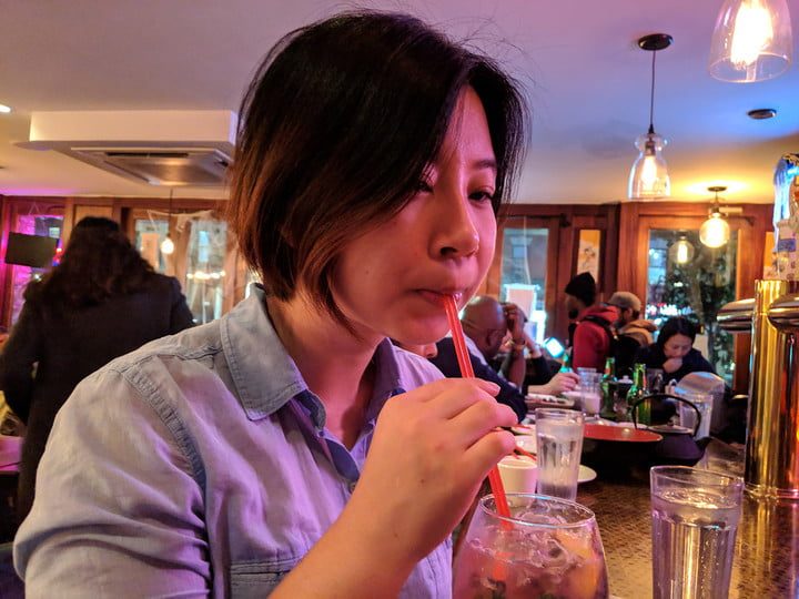 Por ejemplo, en el restaurante, el sujeto tenía tonos rosados en toda la cara porque esa era la única iluminación presente, y Night Sight dio un balance blanco a la imagen, por lo que no se ve como atmosférica. Esto ocurre también con los selfies, que son mucho más equilibrados con el blanco, y pierden la luz rosa que hace que la foto original se destaque. Sin embargo, todavía preferimos las versiones de Night Sight porque son notablemente más nítidas.