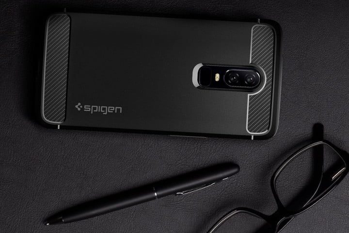 Spigen ha dado un estilo ejecutivo a este típico estuche de TPU al agregar paneles de fibra de carbono en la parte posterior y algunos reflejos brillantes para romper el acabado negro mate. Tiene protectores de aire en las esquinas, un labio elevado alrededor de la pantalla y un patrón de telaraña en su interior, diseñado para proteger tu OnePlus 6 en caso de caídas. También encontrarás aberturas perfectamente cortadas para los puertos, la cámara y otras funciones, junto con cubiertas de botones táctiles, incluida una cubierta del botón de encendido con textura.