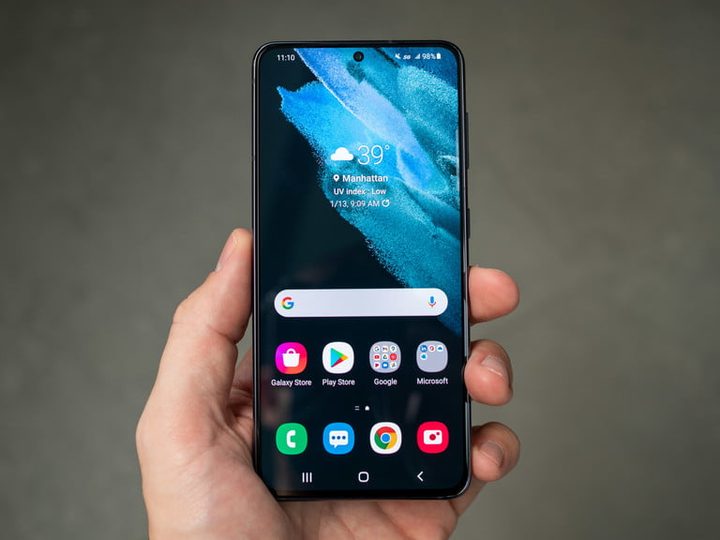 El Galaxy S21 tiene la misma pantalla de borde a borde con un notch para la cámara frontal, similar al S20. El cuerpo del S21 es más delgado que su predecesor, a la vez que un poco más alargado. La parte trasera del S21 es de plástico bajo un marco de aluminio y para quienes buscan opciones de colores, el nuevo modelo de Samsung llega con cuatro distintos.