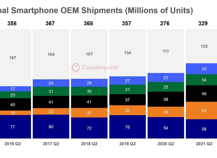 En tanto, Xiaomi sobrepasó por primera vez la cifra de los 50 millones de teléfonos repartidos en un solo trimestre, para un total de 53 millones. Estos números fueron suficientes para dejar a Apple en tercer lugar, en parte gracias a su crecimiento en Europa, América Latina y el sureste asiático; Counterpoint asegura que la demanda por sus teléfonos de gama media es la que más ha aumentado.