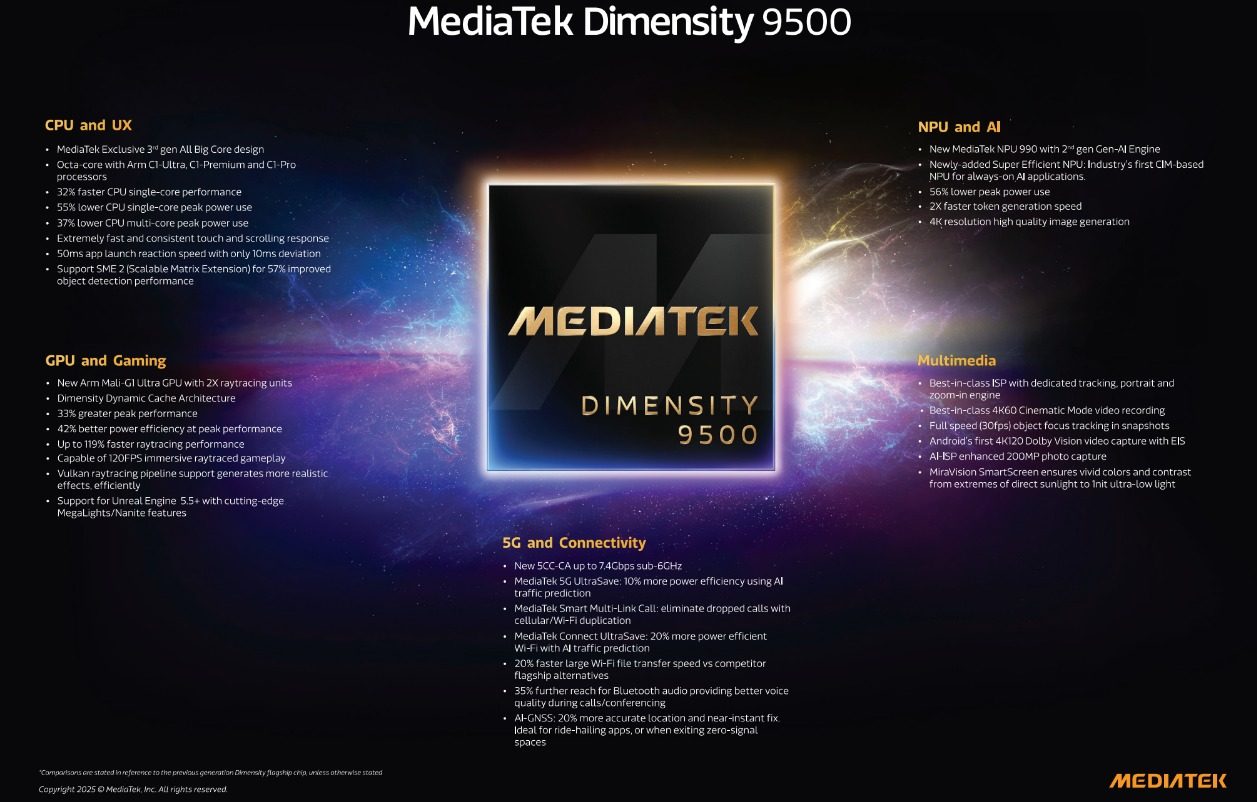 El MediaTek Dimensity 9500 adopta un diseño de CPU All Big Core de tercera generación, que combina un ultra núcleo de 4.21 GHz, tres núcleos premium y cuatro núcleos de rendimiento, con almacenamiento UFS 4.1 de cuatro canales. Este diseño ofrece hasta un 29% más de rendimiento de un solo núcleo y un 16% más de rendimiento de varios núcleos en comparación con la generación anterior, mientras que el ultra core logra hasta un 55% menos de consumo de energía con el máximo rendimiento, lo que brinda a los usuarios una mayor duración de la batería y una mayor productividad.