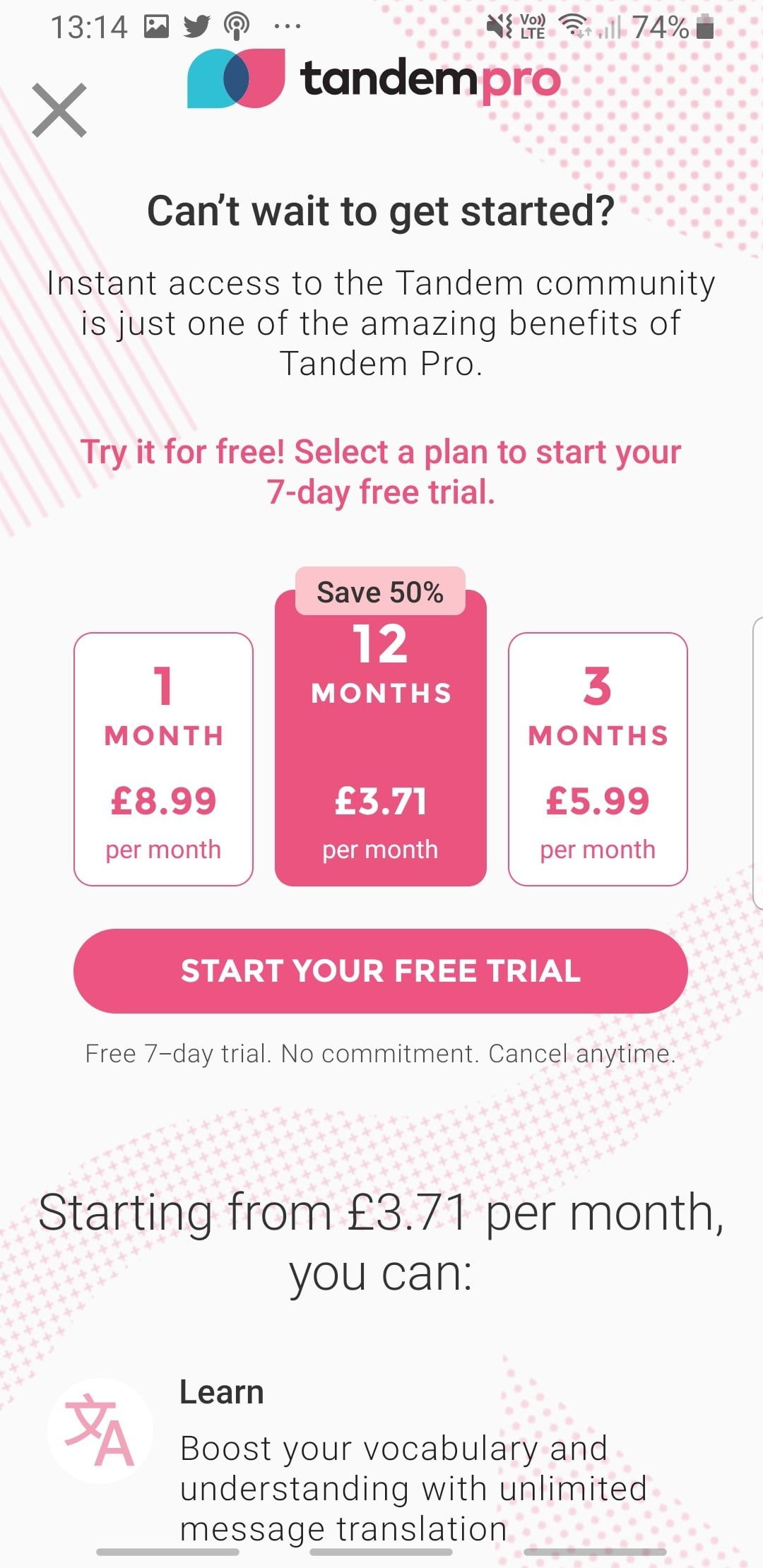 Para registrarte, deberás usar tu cuenta de Facebook o Google. También hay controles de moderador para asegurarse de que se tomas en serio el aprendizaje y eliminar a quienes abusan del servicio. Esto significa que es posible que debas esperar a que aprueben tu perfil. Si estás listo para pasar al siguiente nivel con tu idioma y quieres hablar con un nativo, entonces vale la pena echarle un vistazo a Tandem.