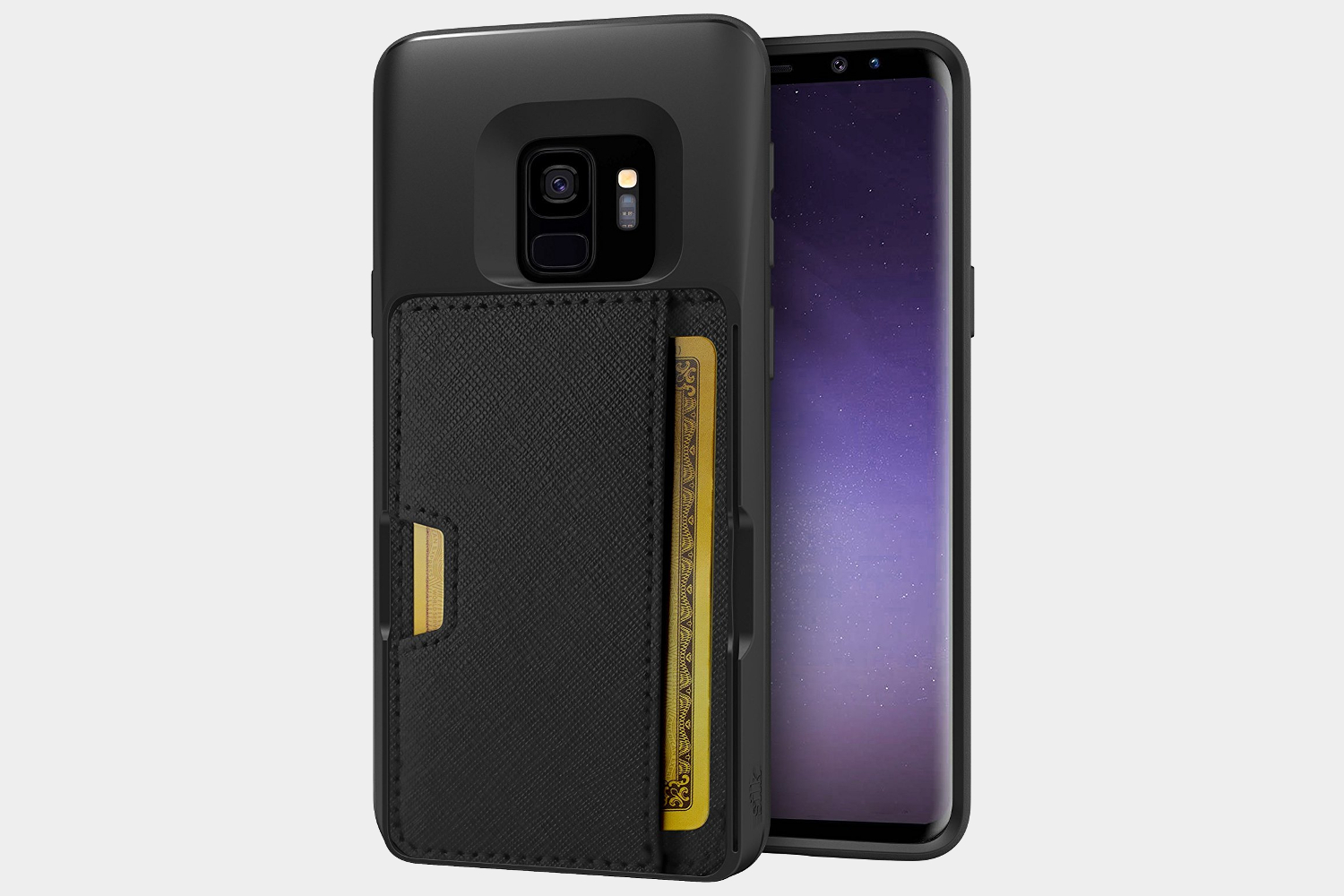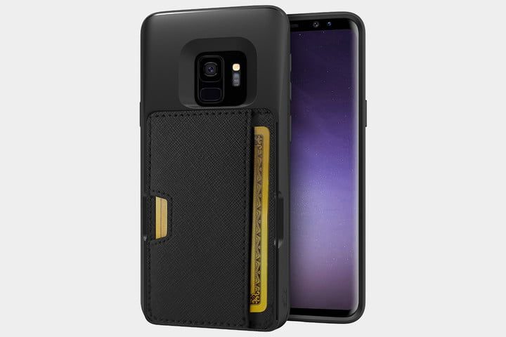 Esta versátil funda-billetera ofrece muchas características atractivas. El bolsillo elástico de su parte posterior tiene espacio para tres tarjetas, por lo que podrás dejar tu billetera en casa. El estuche se extiende por encima y por debajo de la pantalla para protegerlo, y tiene bolsas de aire en las esquinas para mitigar el daño por golpes o caídas. No estamos especialmente enamorados de los recortes de su parte posterior, lo que hace que sea un poco más incómodo acceder al sensor de huellas digitales, pero nos encanta su textura áspera, la cual realmente mejora el agarre. Además, su bolsillo es realmente muy útil. También puedes apuntalar tu S9 y ponerlo en una mesa para ver vídeos usando una de tus tarjetas como soporte.