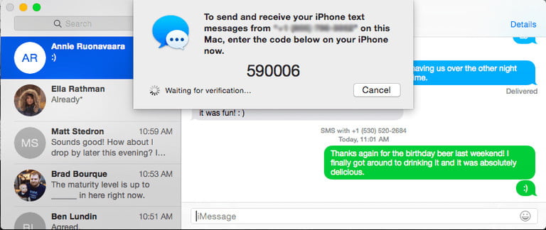Cada vez que un dispositivo sea habilitado, debes ingresar el número de confirmación de seis dígitos en el iPhone. Al hacerlo confirmarás que quieres enviar y recibir mensajes SMS y MMS en tu dispositivo Apple. Puedes o no necesitar ingresar un número de confirmación, dependiendo de la configuración.