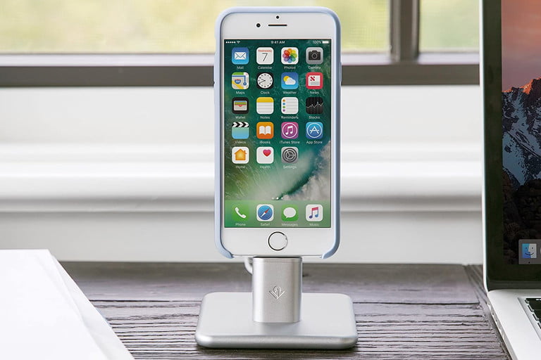 Aquí tienes un elegante pedestal de metal con un acabado en negro, plateado o blanco. El soporte acopla tu dispositivo en la parte inferior, por lo que se puede usar con cualquier iPhone o iPad (excepto los nuevos modelos iPad Pro y iPad Air con un puerto USB-C), con o sin funda.