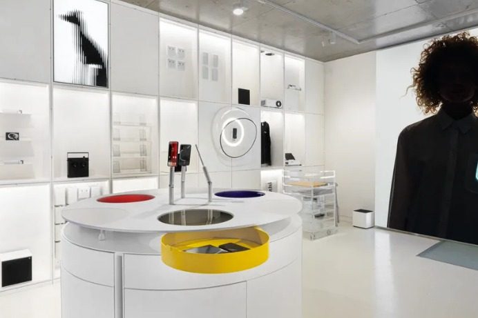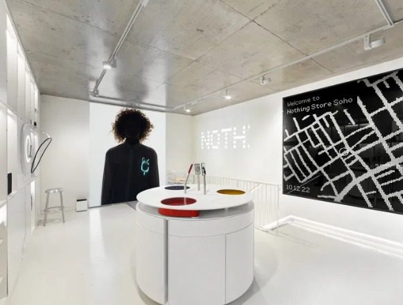 La tienda de 785 pies cuadrados abarca dos pisos, y las primeras imágenes de prensa del piso de la tienda revelan una decoración inspirada en la estética minimalista y transparente de los productos de Nothing.
