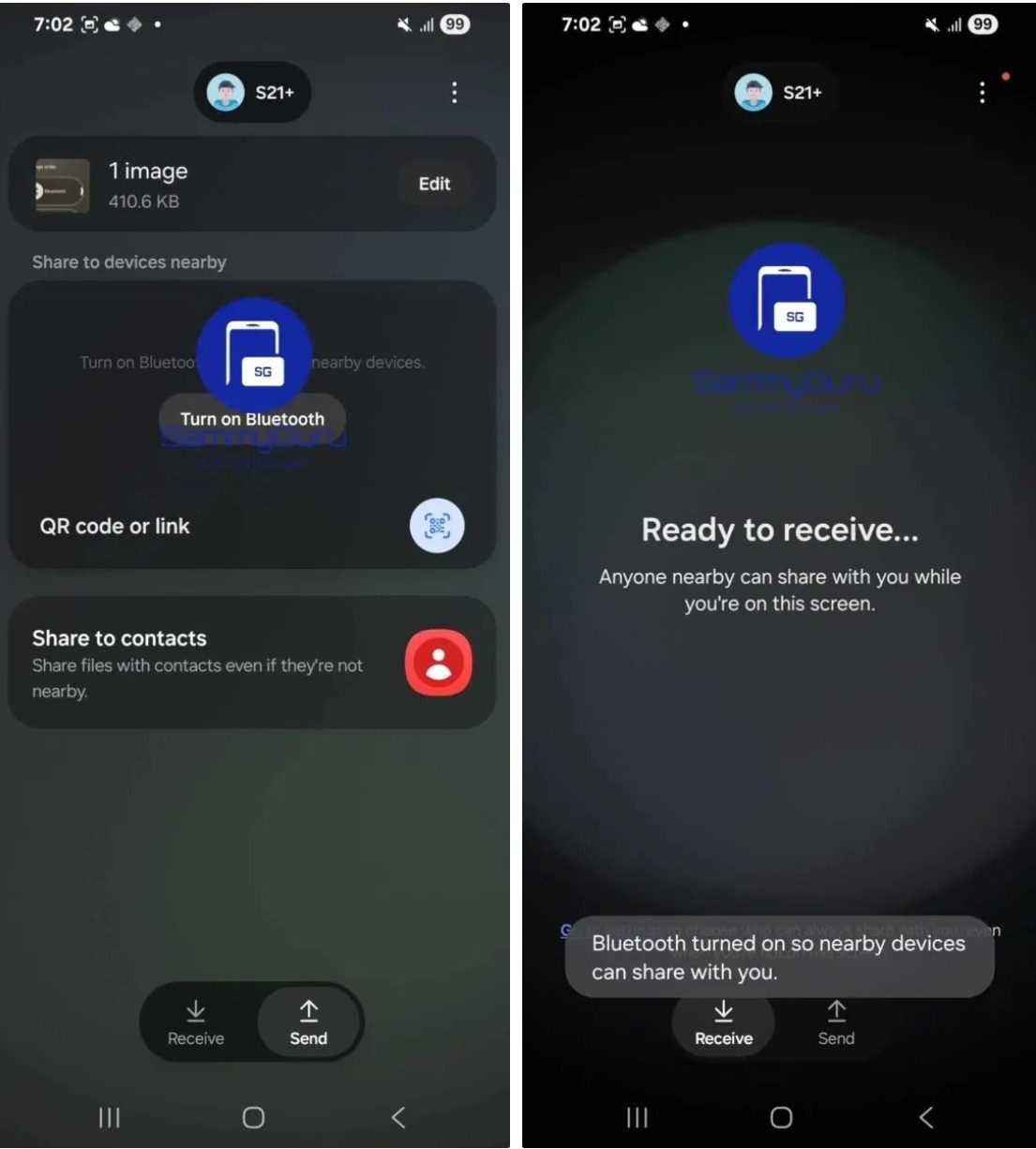 Se espera que la actualización One UI 8.5 refine la interfaz Quick Share actualizada, que se introdujo por primera vez en los teléfonos Samsung con One UI 8. El informe destaca un cambio de los elementos rectangulares y en bloque a otros más estrechos. Más específicamente, el cambio se aplica a la barra flotante en la parte inferior de la página que alberga las pestañas Enviar y Recibir.