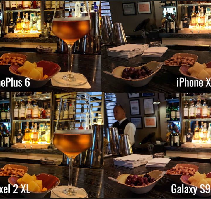 Nuestra siguiente foto está en un bar oscuro y mal iluminado. A primera vista, el iPhone X y S9+ bajaron la temperatura del color, lo que significa que se inclinan más hacia el azul que hacia los rojos en el espectro de colores. Por su parte, el Pixel 2 XL y el OnePlus 6 “se calentaron”. Cuando hacemos zoom en el queso, podemos ver que el OnePlus 6 “flaquea” un poco, no siendo tan nítido como los demás. El Galaxy S9+ parece tener aquí el primer plano más claro.