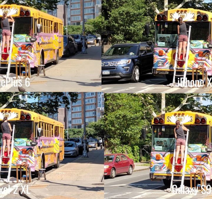 Luego, tomamos una foto de una mujer pintando su autobús escolar. Las imágenes son muy similares, pero cuando hacemos zoom podemos decir que el Pixel 2 XL y el iPhone X tienen el mejor rango dinámico. El Galaxy S9+ y el OnePlus 6 son demasiado similares como para notar la diferencia.