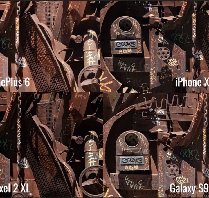 La primera foto es de una escultura de metal, y todas las imágenes se ven bastante similares. Cuando hacemos zoom, el OnePlus 6 obtiene peores resultados en su rango dinámico, que –por si no lo sabes– trata de qué tan brillantes son las partes más brillantes, y cuán oscuras las partes más oscuras. Aquí, apenas se nota. Es importante tener en cuenta que el OnePlus 6 es el teléfono más barato con bastante diferencia.