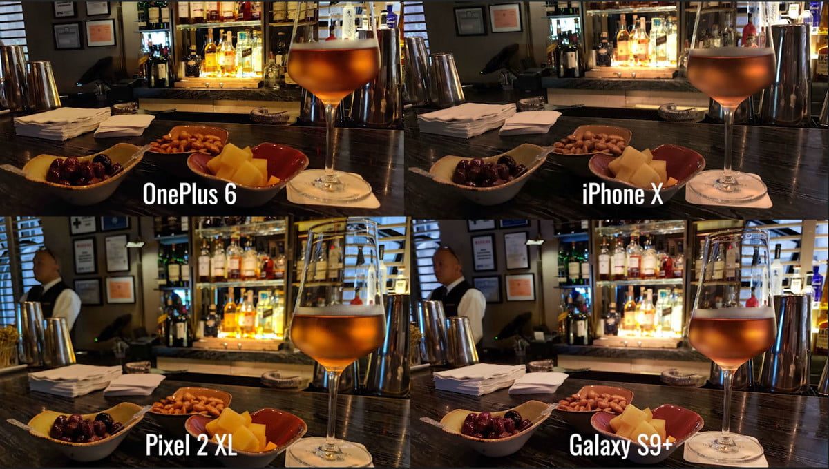 Nuestra siguiente foto está en un bar oscuro y mal iluminado. A primera vista, el iPhone X y S9+ bajaron la temperatura del color, lo que significa que se inclinan más hacia el azul que hacia los rojos en el espectro de colores. Por su parte, el Pixel 2 XL y el OnePlus 6 “se calentaron”. Cuando hacemos zoom en el queso, podemos ver que el OnePlus 6 “flaquea” un poco, no siendo tan nítido como los demás. El Galaxy S9+ parece tener aquí el primer plano más claro.